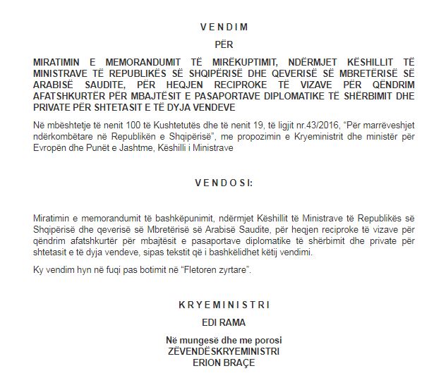 “Miratimin e memorandumit të bashkëpunimit, ndërmjet Këshillit të Ministrave të Republikës së Shqipërisë dhe qeverisë së Mbretërisë së Arabisë Saudite, për heqjen reciproke të vizave për qëndrim afatshkurtër për mbajtësit e pasaportave diplomatike të shërbimit dhe private për shtetasit e të dyja vendeve, sipas tekstit që i bashkëlidhet këtij vendimi. Ky vendim hyn në fuqi pas botimit në “Fletoren zyrtare”, shkruhet në vendim.