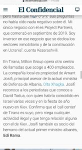 Disa prej mediave ndërkombëtare, që kanë publikuar skandalin, si La Stampa dhe El Confidencial japin detaje interesante sa i përket operimit të Milton Group në Shqipëri. Ky call center në vendin tonë menaxhohet nga Amant Josifi, këshilltar në Ministrinë e Mbrojtjes, i cili perfshihet ne investigim edhe si ortaku i vellait te kryeministrit shqiptar Edi Rama. Josifi ka qene ortaku i Olsi Rames ne Pegasus Communication”,-shkruan zedhenesja.