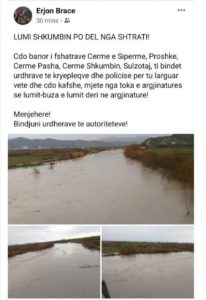 Me një shënim në facebook, ndërsa ka postuar edhe foto të lumit Shkumbin të tej fryrë nga reshjet e orëve të fundit, Braçe shkruan se të rrezikuar janë fshatrat Cermë e Sipermë, Proshkë, Cermë Pasha, Cermë Shkumbin dhe Sulzotaj, ndërsa  thotë se banorët duhet t’u binden menjëherë urdhrave të autoriteteve.