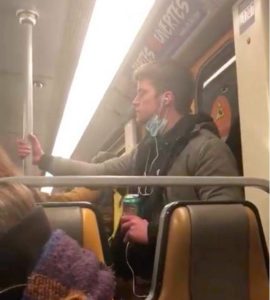 Pasagjeri u filmua nga një tjetër udhëtar në Bruksel dhe shihet teksa ul kaskën e fytyrës së tij para se të fusë dy gishta në gojë e më pas t’i fshijë ato në mbajtësen e metaltë të vagonit.