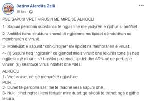 Bëhet fjalë për pedagogen shqiptare Detina Zalli, kërkuese shkencore e cila jeton dhe punon në Oxford, Angli e cila përmes një postimi në rrjetet sociale ka treguar qartë dallimin mes efektit që jep sapuni dhe alkoolit.