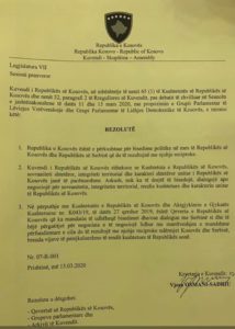 “Sovraniteti shtetëror, integriteti territorial dhe karakteri shtetëror unitar i Republikës së Kosovës janë të pacenueshme. Askush nuk ka të drejtë të bisedojë, dialogojë apo negociojë për sovranitetin, integritetin territorial, rendin kushtetues dhe karakterin unitar të Kosovës”, thuhet në tekstin e rezolutës të miratuar, të cilën e lexoi shefi i Grupit Parlamentar të LDK-së, Arben Gashi.