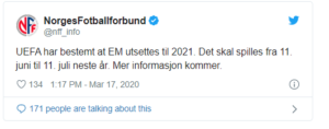 Federata Norvegjeze e Futbollit ka zyrtarizuar përmes faqes së saj në “Twitter” lajmin e shtyrjes së kampionatit Europian Euro 2020 në vitin 2021.