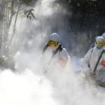 Ekipet e punëtorëve të përshtatshëm janë duke spërkatur përzierje zbardhuese dhe uji me përqendrim të ulët nga kamionët, armët, dronët dhe robotët.