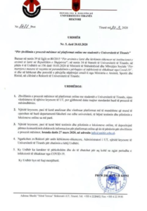 Urdhëri i Rektorit të Universitetit të Tiranës Nr. 5, datë 20.03.2020 “Për zhvillimin e procesit mësimor në platformat online me studentët e Universitetit të Tiranës”