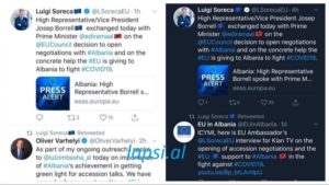 Gjatë paradites ai shpërnadu në Twitter një postim që kishte bërë më herët Komisioneri për Zgjerimin, Oliver Varhelyi i cili fliste për një telefonatë që kishte pasur me kryetarin e Partisë Demokratike, Lulzim Basha.