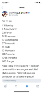 Kreu i bashkise Erion Veliaj ka postuar ne twitter sot duke iu kerkuar bizneseve te medha te mos kerkojne shperblim nga qeveria per kohen e koronavirusit. Te shesin makinat luksoze qe kane, thote ai ndersa ka postuar disa foto me keto makina te shtrenjta.