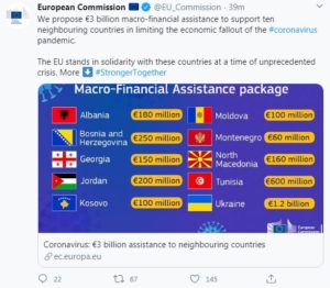 ”Ne propozojmë 3 miliardë euro ndihmë makro-financiare për të mbështetur dhjetë vendet fqinje në kufizimin e ndikimit ekonomik të pandemisë #coronavirus. BE qëndron në solidaritet me këto vende në një kohë krize të tillë,” deklaron KE.