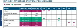 Siç edhe çdokush mund ta faktojë në raportin e NTI të Freedom House, Shqipëria renditet si një demokraci hibride, ku bie në sy rënie në fushën e Qeverisjes Demokratike dhe Procesit Elektoral. Jemi aq mirë saqë renditemi në nivelet e Moldavise dhe Ukrainës.