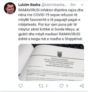 “RAMAVIRUSI infektoi dhjetëra vajza dhe nëna me COVID-19 sepse refuzon të mbyllë fasoneritë e të paguajë pagat e mbijetesës. Por kur vjen puna për të mbytur zërat kritikë si Sonila Meço, ai gjobit dhe mbyll median! RAMAVIRUSI është e keqja më e madhe e Shqipërisë”, thote Basha ne twiterin e fundit.
