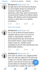 Ka reaguar serish Edi Rama duke fyer ata qe mbrojten Teatrin nderkohe qe i drejtohet regjisorit Edmond Budina me nje tekst te neveritshem. Ti nuk je Shekspiri, i thote ai, pa pike pendese per shenbjen e Teatrit Kombetar.