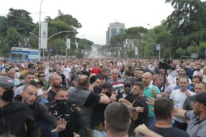 Një numër i madh protestuesish të mbledhur tek Ministria e Brendshme, aty ku një ditë më parë u përleshën me policinë, kërkuan largimin e Ramës dhe Velisë.