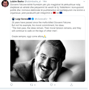 Kryetari i opozites Lulzim Basha ka shpërndarë postimin e ambasadorit të BE, Luigi Soreca në 28 vjetorin e vrasjes nga mafia të gjykatësit Giovani Falcone.