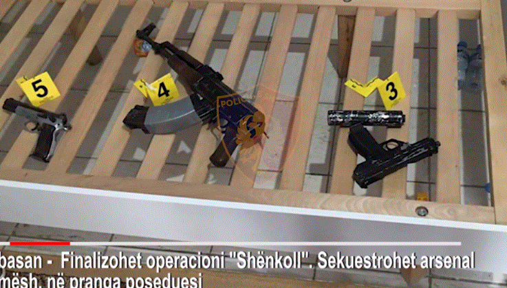 Në kuadër të operacionit, gjatë kontrollit të ushtruar në banesën e shtetasit E. D. 33 vjeç, banues në lagjen Shënkoll, Elbasan, Policia gjeti dhe sekuestroi një arsenal armësh, konkretisht: një kallashnikov, dy pistoleta (njëra prej tyre me silenciator ), 170 fishekë dhe një jelek antiplumb.