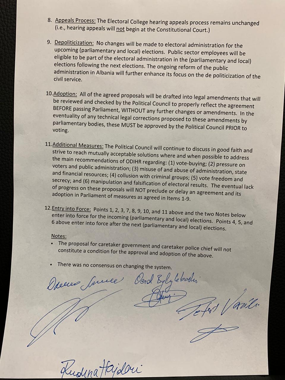 11.Masat shtesë: Këshilli Politik do të vazhdojë të diskutojë me mirëbesim dhe të përpiqet të arrijë zgjidhje të pranueshme reciprokisht, ku dhe kur është e mundur, për të adresuar rekomandimet kryesore të ODIHR-it në lidhje me: (1) blerjen e votave; (2) trysninë ndaj votuesve dhe administratës publike; (3) keqpërdorimin dhe abuzimin me burimet e administratës, shtetit dhe ato financiare; (4) marrëveshjet me grupet kriminale; (5) lirinë dhe fshehtësinë e votës; si dhe (6) manipulimin dhe falsifikimin e rezultateve zgjedhore. Mungesa eventuale e progresit për këto propozime NUK do ta pengojë apo vonojë një marrëveshje dhe miratimin e masave të saj në Parlament, siç është rënë dakord në pikat 1-9.