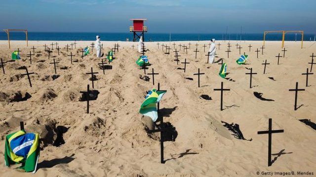 Vullnetarët dhe protestuesit e qeverise kanë gërmuar per te hapur 100 varre në plazhin ikonik të Rio de Janeiro në Copacabana si një kujtesë simbolike per mijëra brazilianëve që kanë vdekur nga COVID-19.