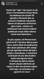 Dy ditë më parë në media qarkulloi lajmi se aktori i njohur i portokallisë, Flor Binaj është i infektuar nga koronavirusi. E pas publikimit të këtij lajmi aktori bëri një reagim përmes rrjeteve sociale duke u shprehur se testi i ka rezultuar pozitiv, por nuk ka shfaqur asnjë shenjë apo simptomë.
