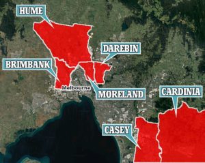 Këto gjashtë zona janë të gjitha në Melbourne – Hume, Casey dhe Brimbank, Moreland, Cardinia e Darebin.