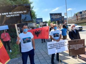 Ata mbajnë pankarta në duar ku shkruhet: “Ku është drejteësia për 20 mijë gra të dhunuara nga regjimi serb?”, “Ky është racizëm”, “Emri Hashim nuk është thjesht një emër, është simbol i një epoke të ndershme”, “Çka t’iu themi fëmijëve të cilët kanë humbur prindërit e tyre gjatë regjimit të Millosheviqit”, e shkrime të tjera.