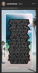 Sara Hoxha konfirmoi me anë të një postimi në Instagram se ishte infektuar me Covid-19. Pak minuta pasi bëri publik lajmin, ajo bëri një tjetër postim në lidhje me virusin, kësaj rradhe për t’ju përgjigjur atyre që e kanë pyetur dhe për të dhënë më shumë detaje për simptomat që ka pasur dhe mënyrën si e ka përjetuar periudhën kur ka luftuar me Covid-in.