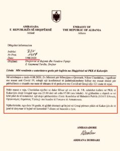 “Kryeministri i vendit i cili është njëkohësisht edhe Ministër i Jashtëm fuqiplotë i Republikës së Shqipërisë, u informua që në datën 5 gusht zyrtarisht për vendimet e marra nga pala greke për të menaxhuar pandeminë me shtetasit që hyjnë në Greqi. 11 ditë më parë Edi Rama e dinte se çfarë do të ndodhte, por vazhdoi pushimet pa e vënë ujin në zjarr për mijëra shqiptarë që e pësuan prej neglizhencës së tij kriminale”, tha Kashaku duke publikuar edhe dokumentat ne lidhje me kete publikuar nga Presidenti.