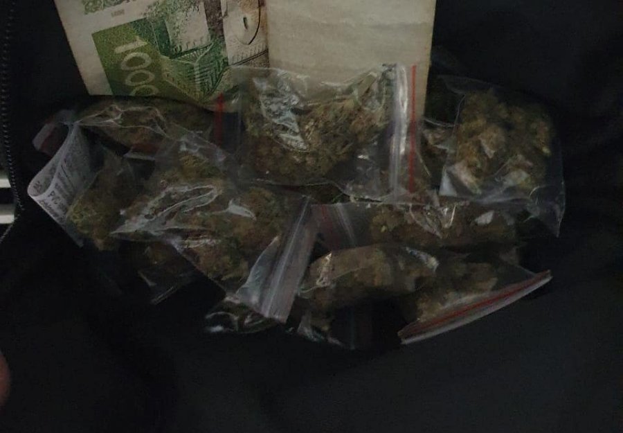 Gjatë kontrollit të ushtruar në çantën e dorës që mbante ky shtetas, janë gjetur dhe sekuestruar në cilësinë e proves materiale 22 doza me lëndë narkotike cannabis sativa dhe një shumë parash të përfituara nga shitja e lëndës narkotike.