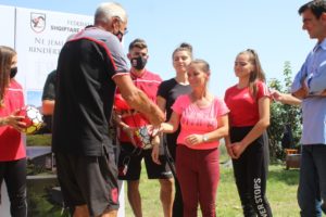Në përfundim të ceremonisë, Presidenti i FSHF së bashku me trajnerin dhe futbollistët shpërndanë edhe disa dhurata për tre fëmijët e familjes Mirdita. /DRONI.al/