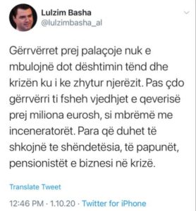“Gërrvërret prej palaçoje nuk e mbulojnë dot dështimin tënd dhe krizën ku i ke zhytur njerëzit. Pas çdo gërrvërri ti fsheh vjedhjet e qeverisë prej miliona eurosh, si mbrëmë me inceneratorët. Para që duhet të shkojnë te shëndetësia, të papunët, pensionistët e biznesi në krizë”,-shkruan Basha.