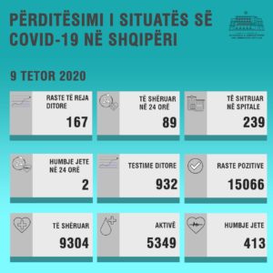 Ministria e Shendetesise njofton se gjate 24 oreve te fundit jane infektuar me koronavirus 167 persona, ndersa dy paciente kane nderruar jete. Keshtu numri i personave te infektuar qe nga fillimi i pandemise ka shkuar ne 15066, ndersa ai i viktimave llogaritet 413.