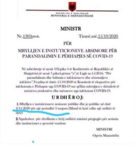 Ministria e Arsimit ka reaguar në lidhje me një dokument të falsifikuar që po qarkullon në rrjetet sociale sipas të cilit urdhërohet mbyllja e shkollave duke filluar nga data 2 nëntor.