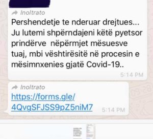 Ministria ka urdhëruar drejtuesit e shkollave nëpërmejt ZA-ve, të detyrojnë mësuesit t’u shpërndajnë prindërve një pyetësor-ofertë në emër të pandemisë, të përgatitur nga një qendër didaktike private që operon në fushën e kualifikimeve e trajnimeve profesionale.
