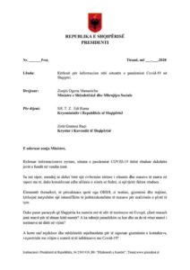 Presidenti i vendit Ilir Meta ia ka nisur nje leter ministres se Shendetesise Ogerta Manastirliu ne lidhje me masat qe jane marre per te perballuar perkeqwsimin e situates se pandemise.