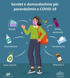 Ndërkohë me anë të një fotoje ilustruese rekomandohen sendet personale që duhet të kemi me vete për parandalimin e Covid-19: Maskë, dezinfektant, larës duarsh, shishe personale, kartëpeceta dhe vitaminë C. /DRONI.al