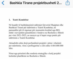 “Kur mendon se ke parë gjithçka bëhu gati të shohësh dhe më shume”, shkruan Jorida Tabaku teksa ka publikuar dokumentin ku kryetari i Bashkise se Tiranes Erion Veliaj kërkon financimin prej 36 milione euro per Teatrin.