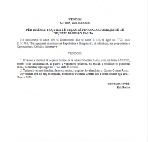 Këshilli i Ministrave vendosi: 1. Dhënien e trajtimit të veçantë familjes të të ndjerit Klodian Rasha, i cili, në datën 8.12.2020,humbi jetën aksidentalisht, si pasojë e veprimeve policore, në masën e tetë-fishit të pensionit social, të miratuar sipas ligjit nr. 7703, datë 11.5.1993.2.