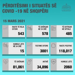 COVID19/ Ministria e Shëndetësisë: 2478 të vaksinuar, 3001 testime, 578 të shëruar, 543 raste të reja dhe 15 humbje jetë në 24 orët e fundit.