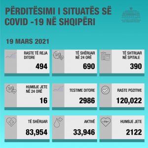 COVID19/ Ministria e Shëndetësisë: 4,998 të vaksinuar, 2986 testime, 690 të shëruar, 494 raste të reja dhe 16 humbje jetë në 24 orët e fundit.