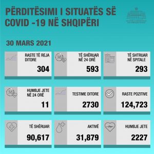 Situata e COVID19 në 24 orët e fundit është si vijon: Janë kryer 2730 testime, nga të cilat kanë rezultuar pozitivë 304 qytetarë.