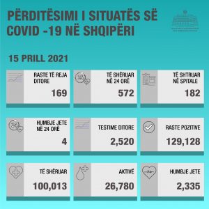 Situata e COVID19 në 24 orët e fundit është si vijon: Janë kryer 2520 testime, nga të cilat kanë rezultuar pozitivë 169 qytetarë.