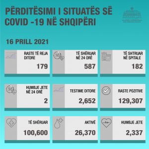Situata e COVID19 në 24 orët e fundit është si vijon: Janë kryer 2652 testime, nga të cilat kanë rezultuar pozitivë 179 qytetarë.