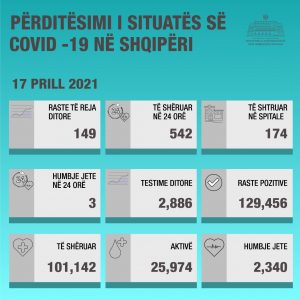 COVID19/ Ministria e Shëndetësisë: 2886 testime, 542 të shëruar, 149 raste të reja dhe 3 humbje jete në 24 orët e fundit.