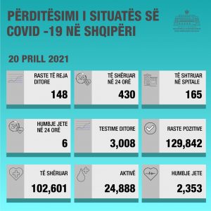 COVID19/ Ministria e Shëndetësisë: 3008 testime, 430 të shëruar, 148 raste të reja dhe 6 humbje jete në 24 orët e fundit.