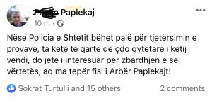 “Nëse Policia e Shtetit bëhet palë për tjetërsimin e provave, ta ketë të qartë që çdo qytetarë i këtij vendi, do jetë i interesuar për zbardhjen e së vërtetës, aq ma tepër fisi i Arbër Paplekajt!”, shkruan në një postim një i afërm i Arberit. a.c