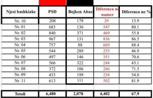 Shihni dallimin mes votave të Boiken Abazit dhe PSD në 11 zonat urbane në Tiranë, dhe bëni krahasimin mes Njësisë 10 ku pati votim e numërim elektronik, dhe njësive të tjera, ku kanë administruar procesin komisionerët e partive.
