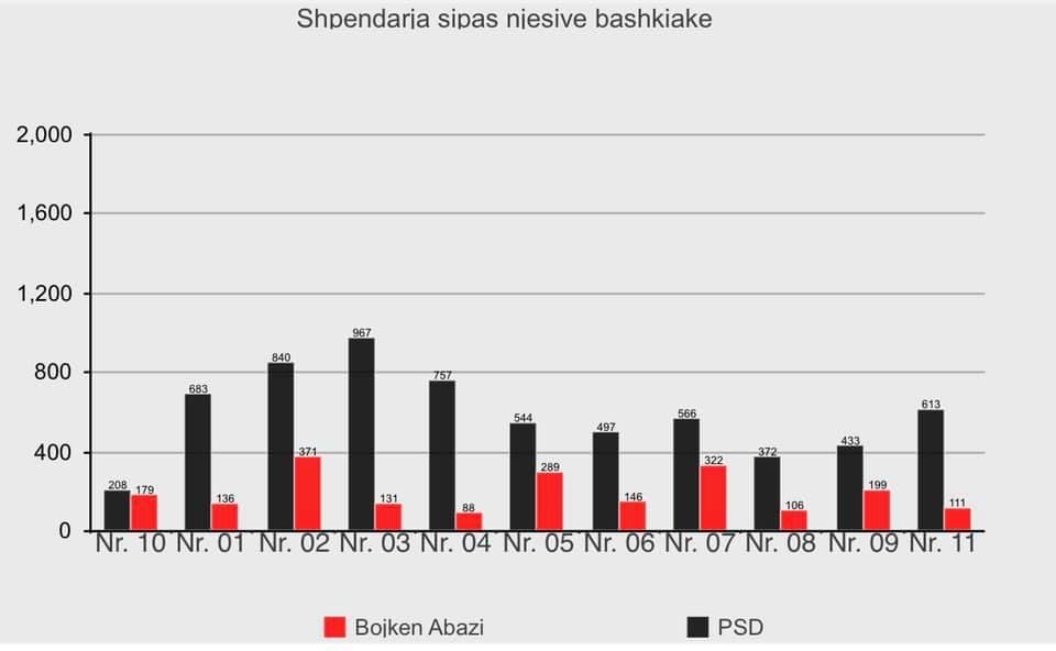 Shihni dallimin mes votave të Boiken Abazit dhe PSD në 11 zonat urbane në Tiranë, dhe bëni krahasimin mes Njësisë 10 ku pati votim e numërim elektronik, dhe njësive të tjera, ku kanë administruar procesin komisionerët e partive.