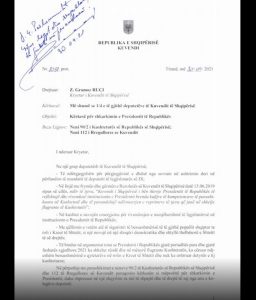 Kërkesa mban firmat e 50 deputetëve të Kuvendit, të cilët kërkojnë shkarkimin e Presidentit, me argumentin se ka shkelur Kushtetutën para dhe gjatë fushatës zgjedhore të 25 prillit.