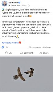 Tanimë ajo konsiderohet një qendër e preferuar e Shpendëve të Rrallë dhe për herë të parë kërkuesit kanë hasur çiftin e qyqes me çafkë në zonën e mbrojtur Vjosë-Nartë ku ka lëshuar vezë, duke shtuar familjen e larmishme të shpendëve në këtë vend të bekuar”, shkruan Rama. a.b