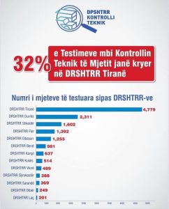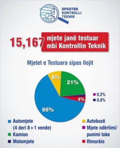 “Nga rinisja e shërbimit të kontrollit teknik, tagër tashmë ekskluziv i DPSHTRR, (në 15 ditët e para) janë testuar 15,167 mjete nga të cilat: 10,063 Automjete (4 deri 8+1) (66%), 1,156 autobusë (8%), 3,179 Kamionë (21%), 617 Rimorkio (4%), 120 Motomjete (0.8%), 32 Mjete Ndërtimi/Punimi Toke (0.2%)”.