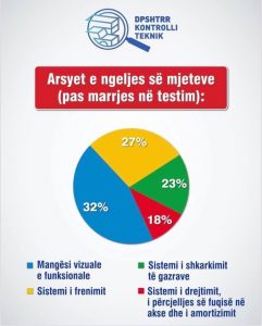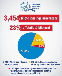 “3,454 mjete ose 23% e totalit të mjeteve janë ngelur/refuzuar! 2,607 (75.4%) Mjete janë ritestuar pas riparimeve dhe plotësimit të normave! 667 (19.4%) Mjete të ngelura, u ndalohet qarkullimi dhe priten për t’u riparaqitur në testim pas riparimeve! 180 (5.2%) Mjete të refuzuara, u ndalohet qarkullimi (xhama të dëmtuar, goma të tejkonsumuara, defekte të rënda në sisteme, pamje e jashtme jo e rregullt)!”