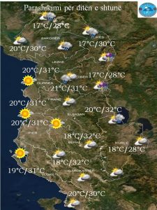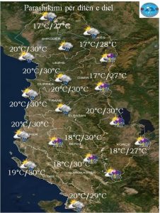 Kjo fundjavë do të karakterizohet nga hyrja e masave të paqendrueshme. Dita e shtunë do të ketë mot me kthjellime e vranësira në zhvillim. Gjatë orëve të mesditës në zonat malore e pjesërisht në ato kodrinore do të ketë reshje shiu. Këto do të jenë në afate të shkurtra kohore dhe ne formën e shtrëngatave. Në ekstreme të izoluara malore nuk do të mungojnë dhe rrufetë me bresher.